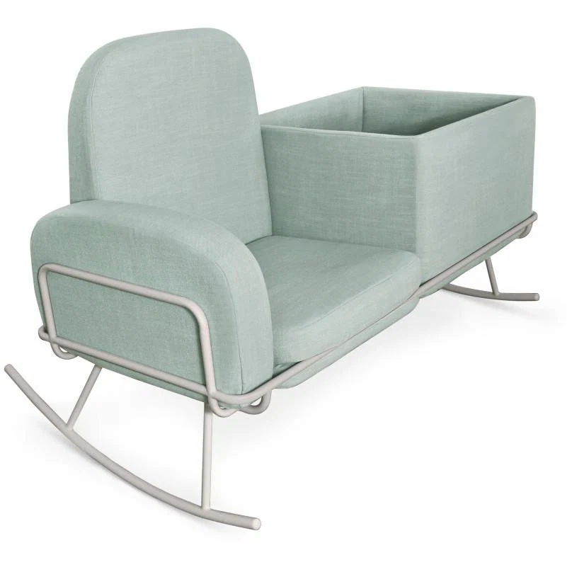 Interplay between soft, rounded wool cushions and molded powder-coated tubular steel framing balance each other, creating a streamlined finish. Ergonomic arm height supports comfortable feeding to the gentle rocking cadence of the rocker. An easy drop and tie conversion process transforms the Ami to a double seat rocker.